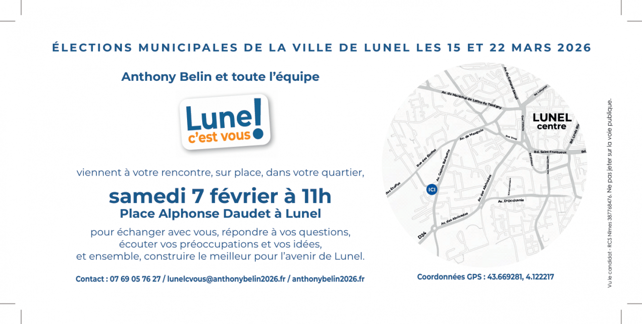 Anthony Belin et toute l’équipe Lunel C’est Vous! viennent à votre rencontre, sur place, dans votre quartier, samedi 7 février à 11h, Place Alphonse Daudet à Lunel pour échanger avec vous, répondre à vos questions, écouter vos préoccupations et vos idées, et ensemble, construire le meilleur pour l’avenir de Lunel.